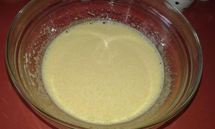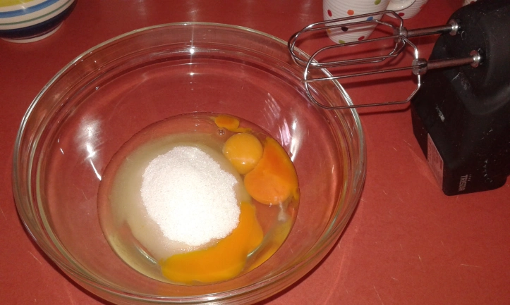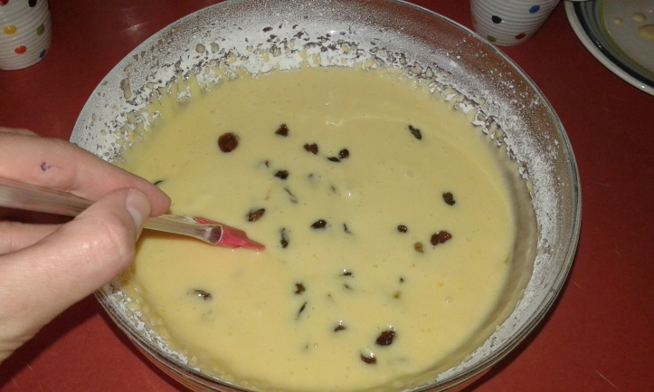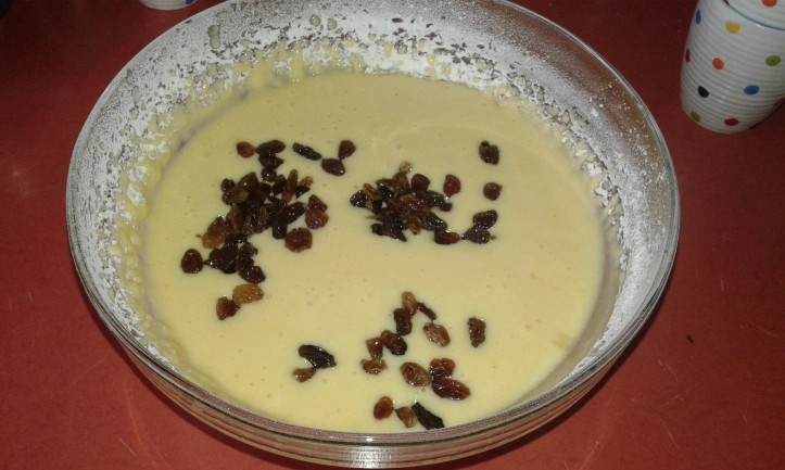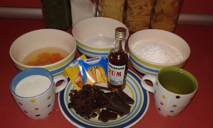 Jaja penasto umutiti sa kristal šećerom i vanil šećerom.Zatim dodati ulje i jogurt,sve vreme mutiti lagano.Polako dodavati brašno i mutiti,kako se ne bi stvorile grudvice.Suvo grožđe natopiti rumom,pa umešati u smesu.