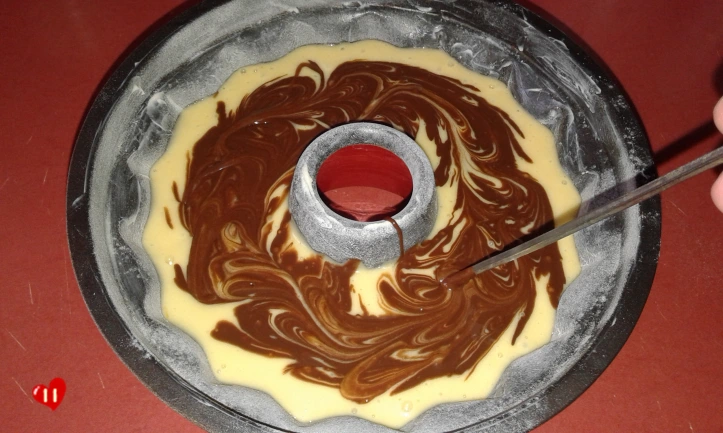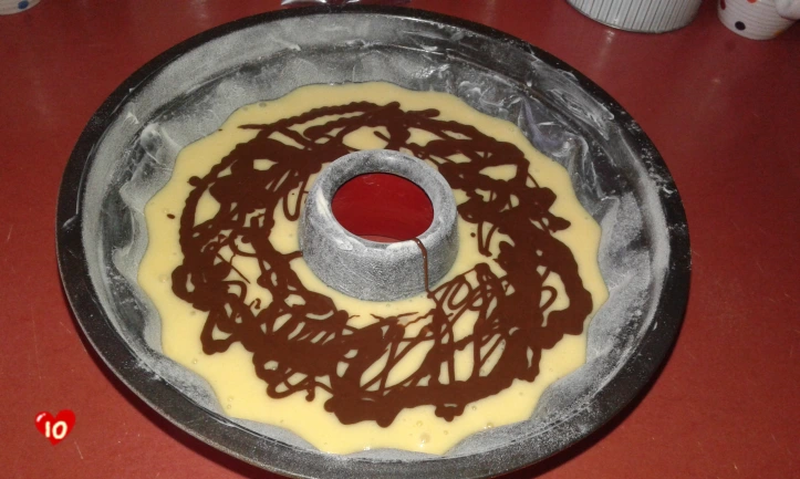 Sipati testo u kalup kao na slici,ne do samog vrha,kako ne bi izaslo iz kalupa tokom pečenja.Sipati otopljenu čokoladu,pa nežno umešati u testo.