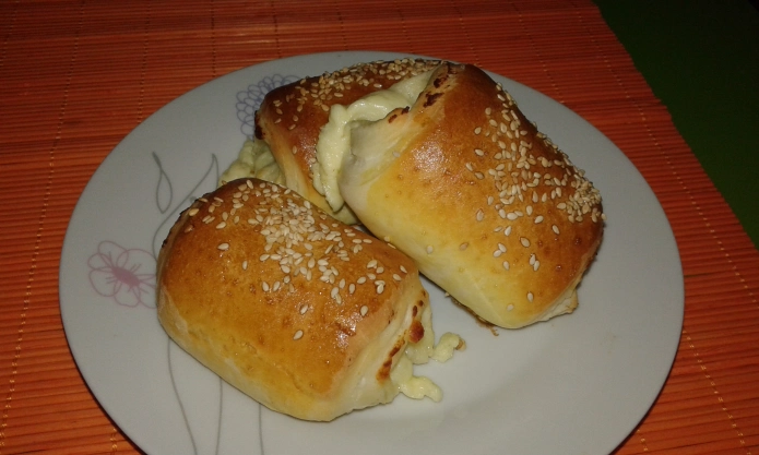 U mlako mleko rastopiti kvasac i šećer. Zatim dodati jogurt i so,pa postepeno dodavati brašno. Testo treba da bude mekano i da se ne lepi za ruke. Posudu namazati uljem,pa prebaciti testo i ostaviti da se udvostruci. Nadošlo testo premesiti još jednom. Zatim podeliti na dve jufke. Svaku jufku podeliti na tri manje. Razvuci jednu pa premazati omeksalim margarinom,tako uraditi i sa drugo,treću tj zadnju ne mazati. Razvuci u pravougaonik,na ivicu staviti fil od zgnjecenog sira koji smo prethodno sjedinili sa malo ulja. Umotati u rolnu,i seći na rolnice. Premazati jajetom,posuti susam i peci dok ne porumene.