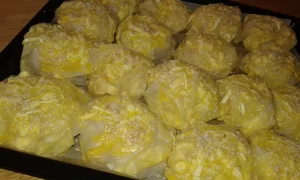 Jaja umutiti penasto,dodati sir,ulje,kiselu vodu i prašak za pecivo. Po tri kašike nadeva na koru. Jedna kora jedna pitica.